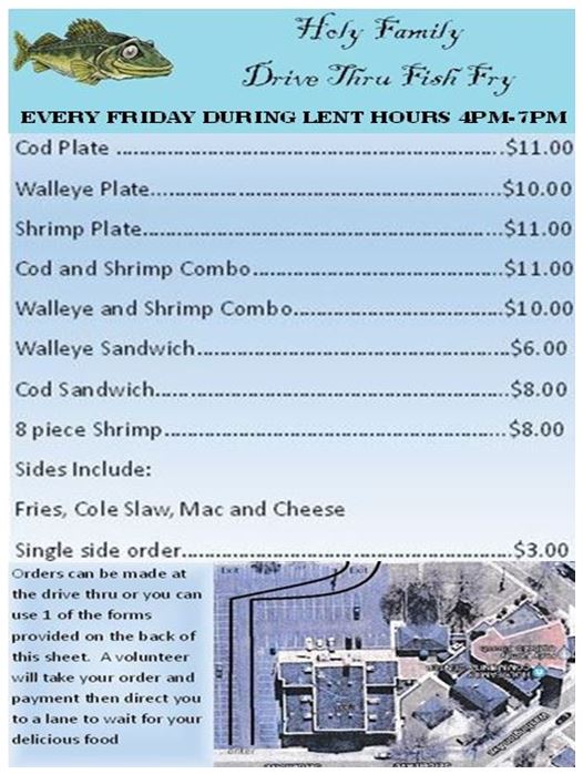 Join us every Friday during Lent for the Holy Family Drive-Thru Fish Fry at Holy Family Church, located at 2606 Washington Avenue. Fish will be served from 4 p.m. to 7 p.m. See the menu below.