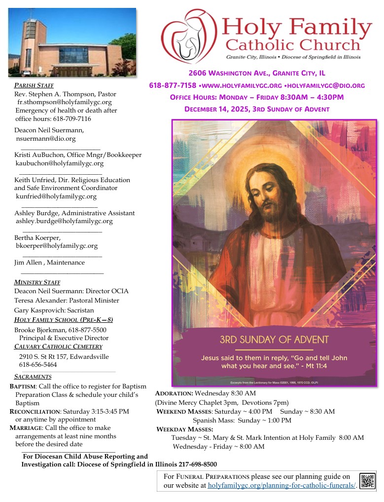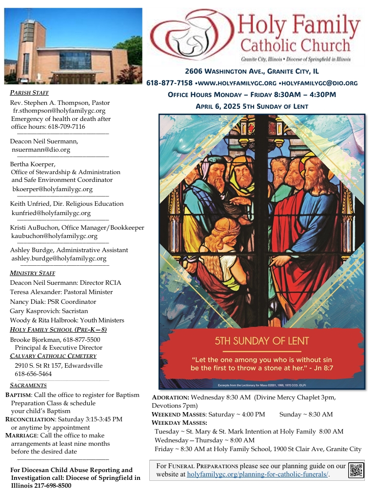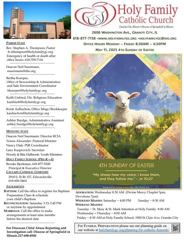 If you need a copy of the bulletin, you may pick up a paper copy of the bulletin in the back of the church or outside of the parish office. If you are unable to attend church, a bulletin can me mailed to you. Please contact Ashley in the Parish Office. 618-877-7158