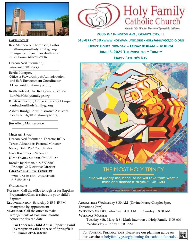 Don’t miss out on the weekly happenings of the parish….read the parish bulletin! If you have announcements for the bulletin, please submit them to the parish office by Monday at 12 p.m. or email holyfamilygc@dio.org.